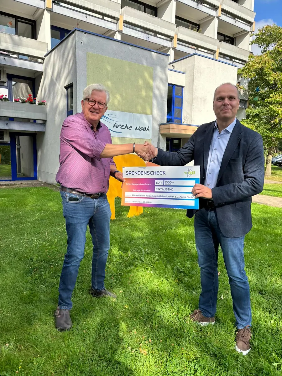 „Uns und unserem Team ist es ein großes Anliegen, immer wieder gezielt soziale Einrichtungen zu unterstützen – insbesondere Einrichtungen, die sich um Kinder und Jugendliche kümmern. Das, was die Arche Noah konzeptionell und pflegerisch anbietet, ist so wichtig für die die Gäste der Arche. Das Konzept und die Zusammenarbeit zwischen Arche-Team und Arche-Förderverein sind herausragend. Hier ist unsere Spende genau richtig platziert!“. Und auch das Arche-Neubauprojekt und die Kampagne NOAHS FREUNDE kamen zur Sprache. Wolfgang Heinberg: „Ich freue mich sehr, dass ich unsere Zukunftsideen und unsere Kampagne so intensiv mit Herrn Noteboom besprechen konnte, der mit seinem Unternehmen und dem Konzept „FREI IST FREI“ auch nah in den Alltagsthemen im Krankenhaussektor und in der Altenhilfe beheimatet ist. Und selbstverständlich sage ich 1000 Dank für 1.000 Euro, die dem Förderverein Kinderhospiz Gelsenkirchen e.V. Arche Noah helfen, wichtige Fördervereinsvorhaben für lebenslimitierend erkrankte Kinder und Jugendliche und ihre Familien zu finanzieren.“